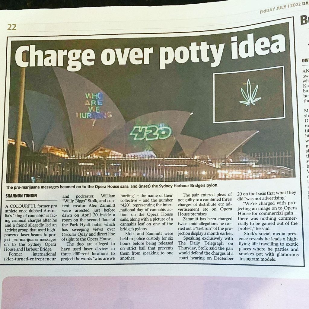 After blowing my knee out three times, breaking my back twice, losing multiple friends to the sport, and losing interest in professional skiing, I shifted towards media and event management, eventually getting involved in the cannabis industry and movement. I started producing music videos, magazines, creative agencies, and other ventures. I started a cannabis dispensary near Mammoth Mountain in California and launched a CBD company. I’ve also been involved in various stunts to promote cannabis awareness, including the well-known Sydney Opera House stunt. We also set up a fake hydroponic grow setup on one of the busiest streets to make a statement; those types of stunts gave me the same adrenaline rush that skiing brought me.
