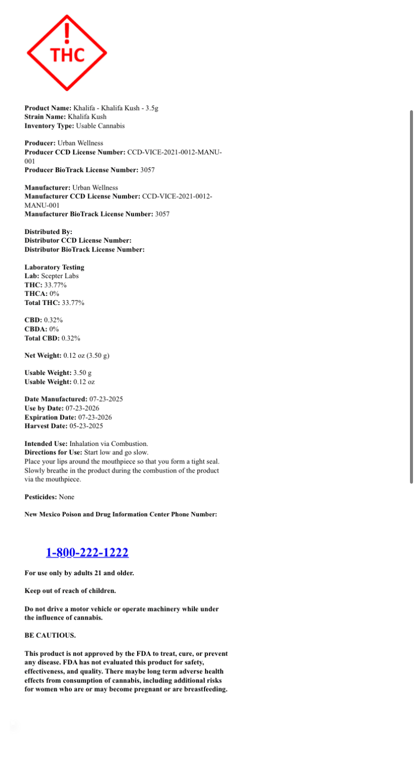 Sadly, Khalifa Kush (both the strain and the brand) is only available at Urban Wellness dispensaries in New Mexico. The chain has nearly a dozen locations in Albuquerque as well as one in Las Cruces and Hobbs, but that leaves most residents of the Land of Enchantment without easy access to Wiz’s bud.